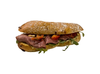 Milano broodje ingestreken met pestomayo, belegd met ruccola, rosbief, gekruide tomaatjes en pijnboompitjes.