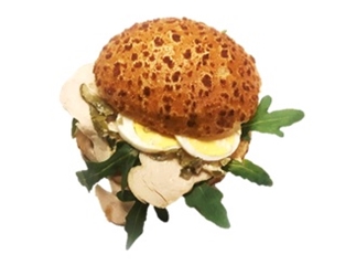Lekker knapperig tijgerbolletje ingestreken met chili mayo saus, belegd met rucola, kipfilet, eitje en augurkje.
