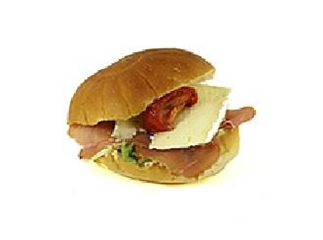 Zacht broodje met huisgemaakte dressing, slamix, coburger ham, brie en sun tomaatjes.